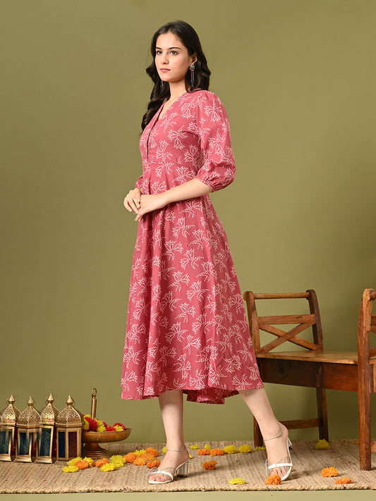 Floral Printed V-Neck Gathered Cotton Empire Midi Dress