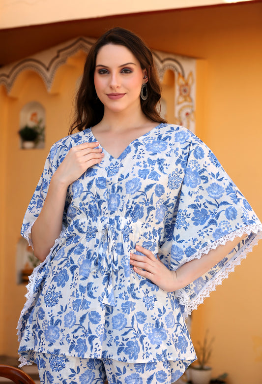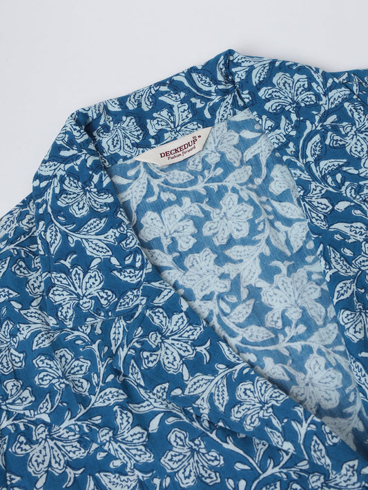 Blue & White Textured Print Lace Embroidery Detaling A-Line Dress