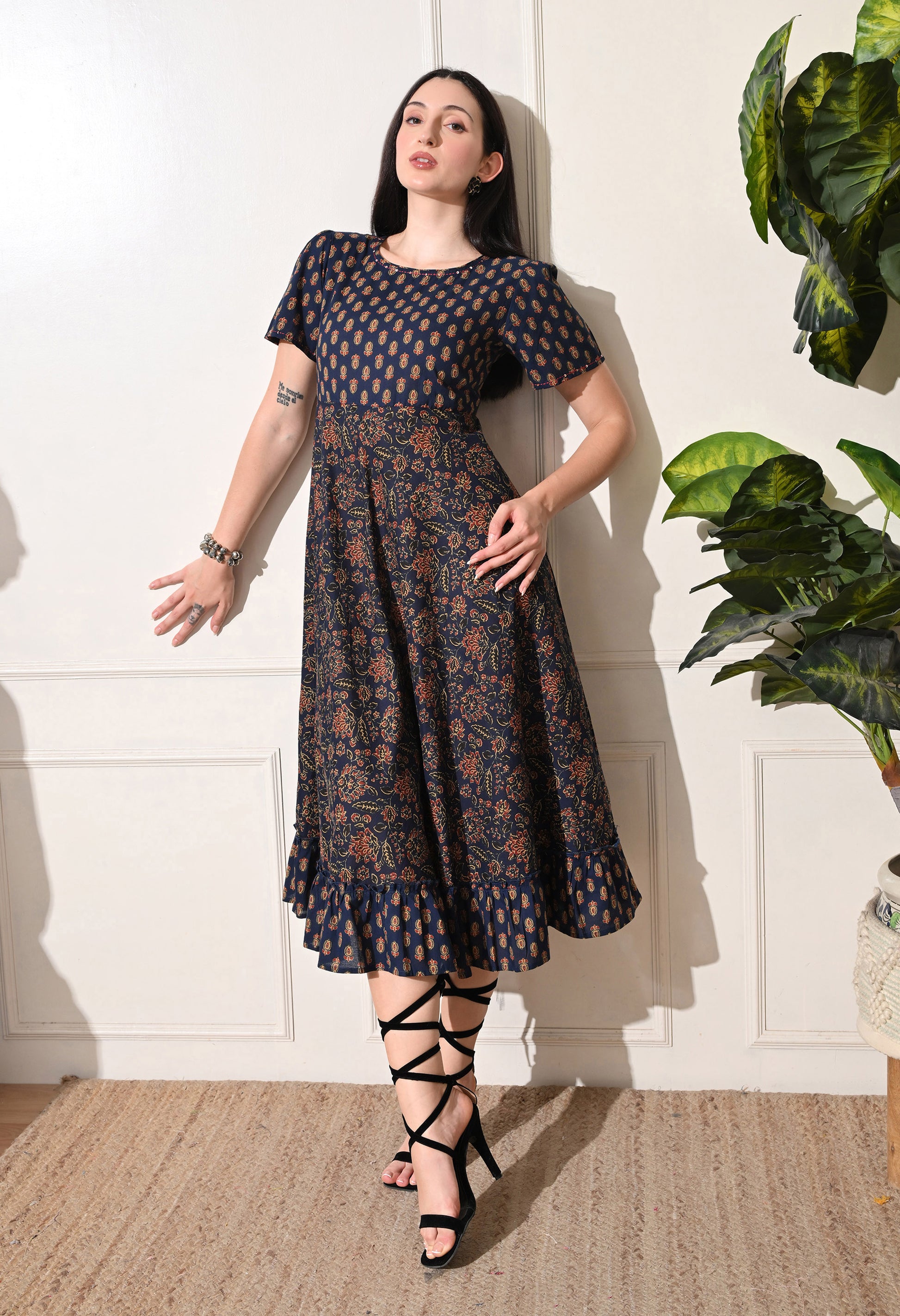 - Description: Attractive Ajrak Printed Women's Ethnic Fusion Dress has a pocket, flared silhouette adds an elegant and graceful touch allowing you to move freely and radiate confidence with every step you take. This dress can also be worn as a kurta.