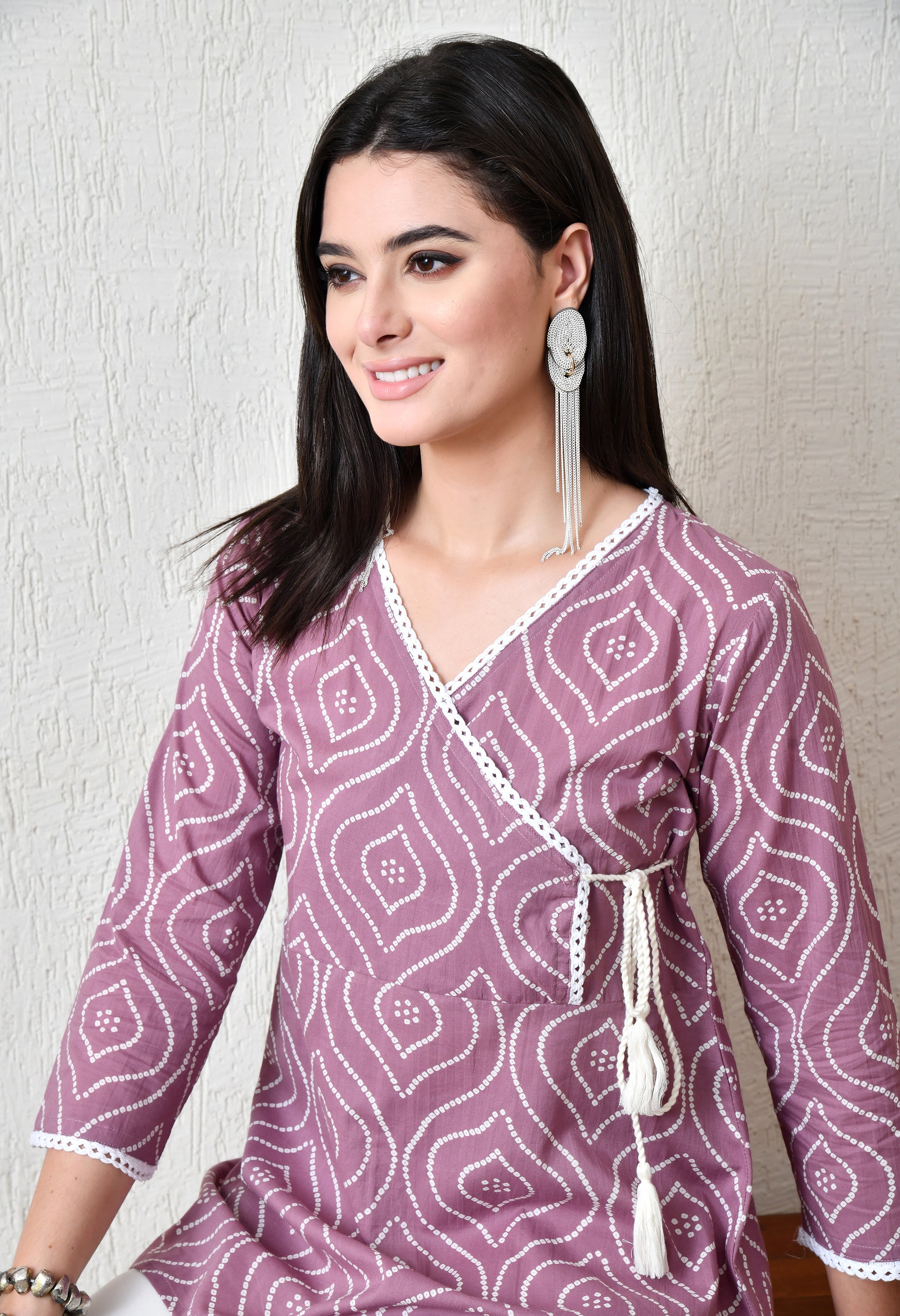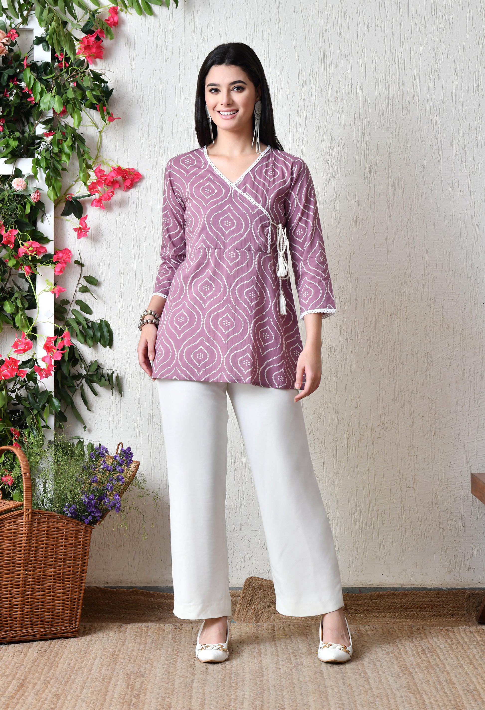 - Description: Mauve wrap top is a mid length, light-colored essential that adds a touch of elegance and comfort to any outfit. Crafted with lightweight and breathable woven material, this top is designed to keep you stylishly cool during those warm summer days and evenings.