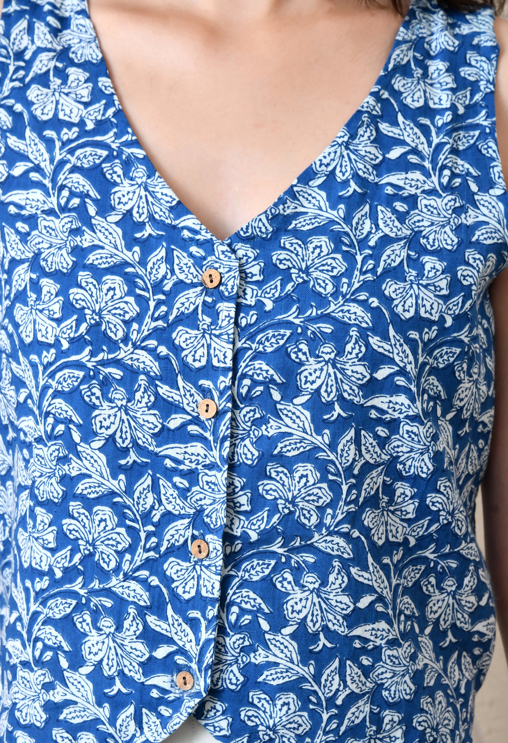 - Description: Add style to your wardrobe with this Blue button down waistcoat jacket crafted from best cotton fabric. Its sleeveess and can be worn with or without a top to create an effortlessly stylish look, perfect for a variety of occasions. The lightweight fabric ensures comfort and breathability, making it a reliable choice for warm climates.