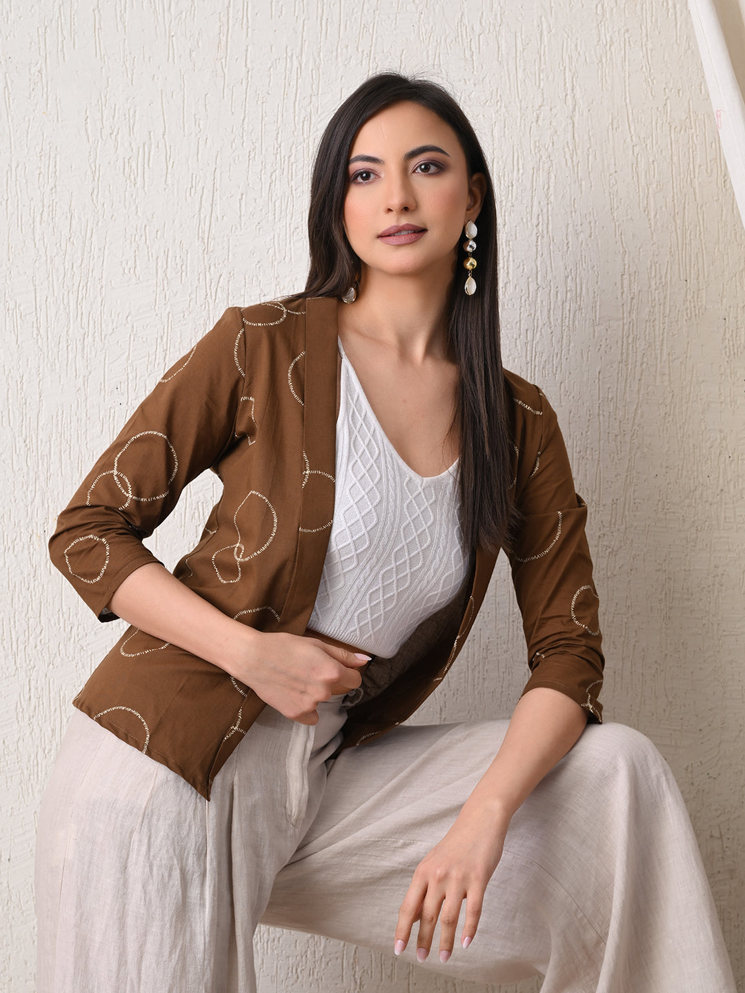 - Description: Brown geometric kantha Cotton Regular Shrug Has A Collar Neck And Three Quarter Sleeves. Immerse Yourself In Its Comfort, Revel In Its Style, And Embrace The Rich Heritage That Comes With Wearing A Handcrafted Masterpiece.
