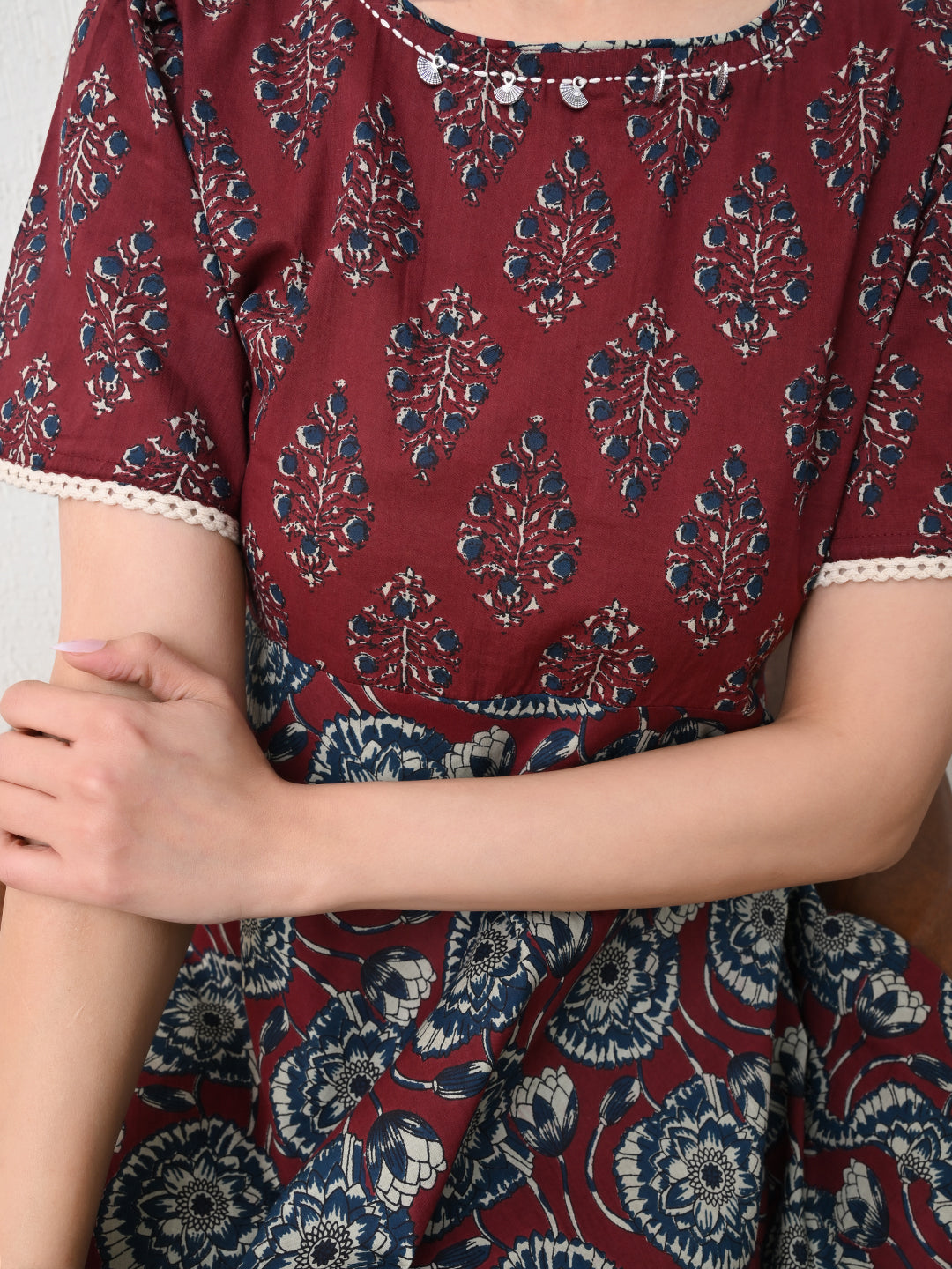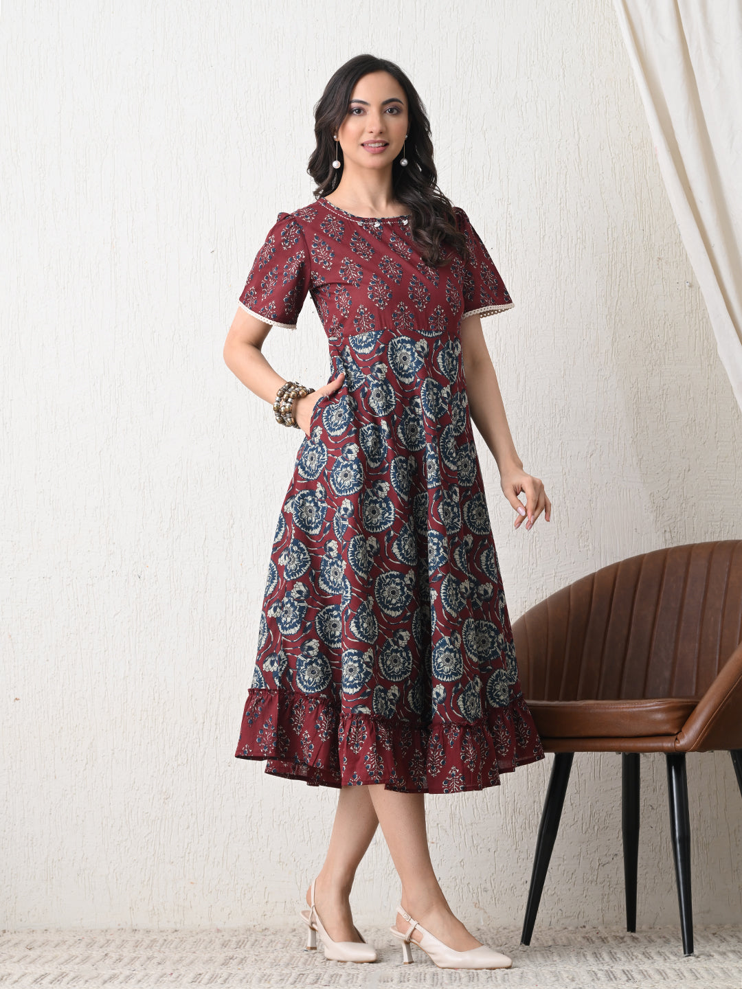 - Description: Printed Cotton Dress with bead work on neck design and short sleeves for easy movement and keeps you cool during warmer days. The print and flare offers a classic and timeless appeal, making it suitable for various occasions and easy to accessorize.