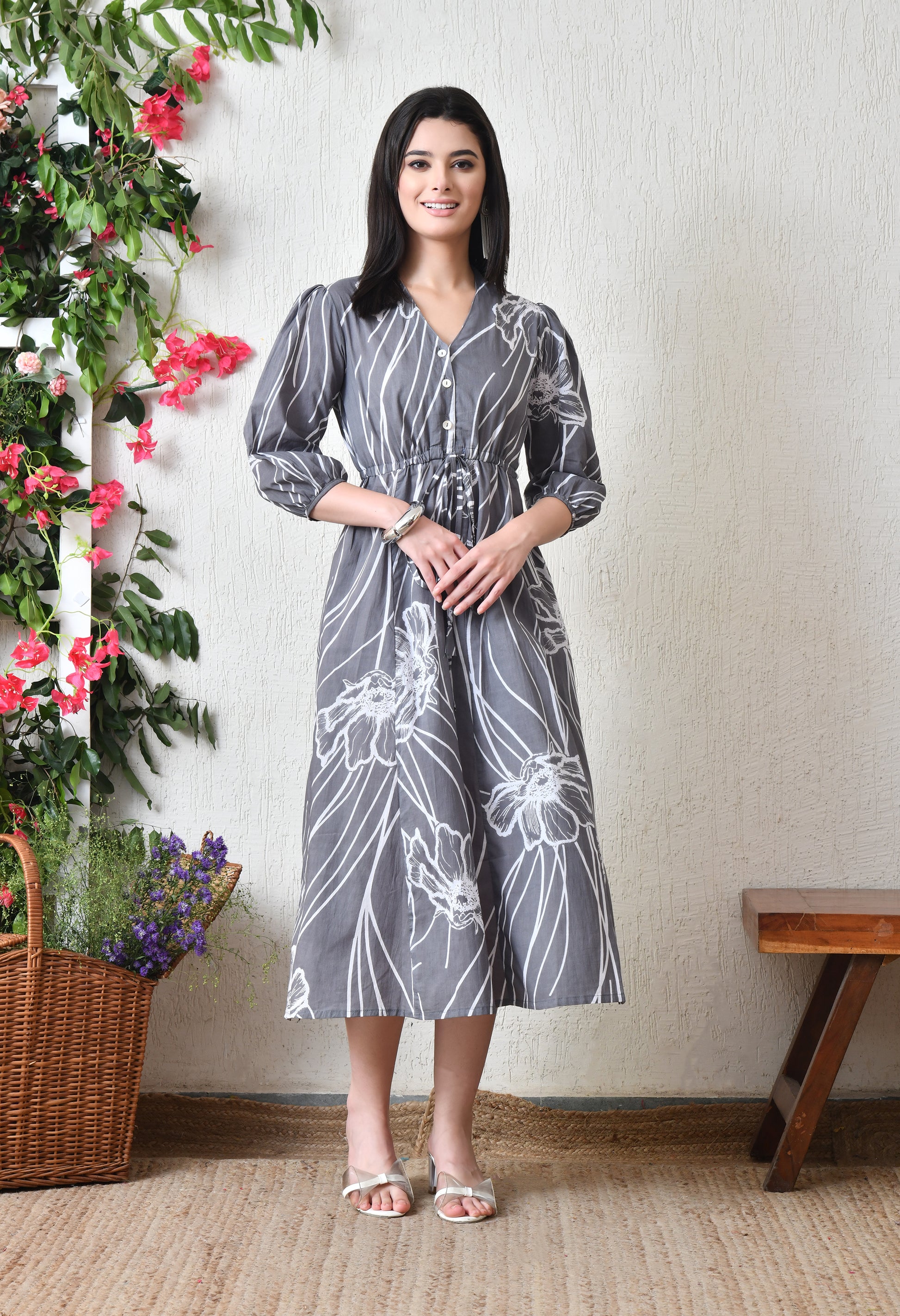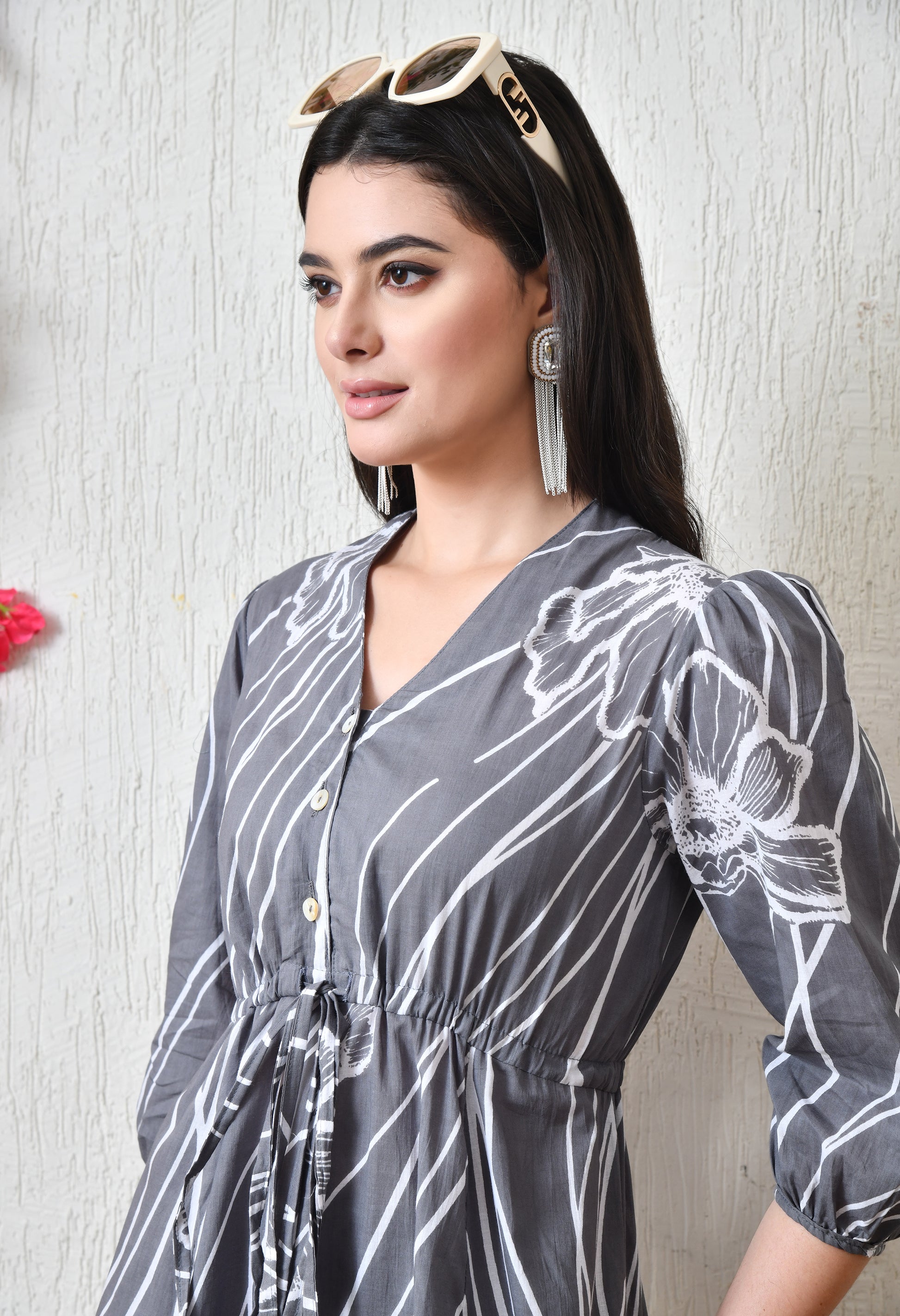 - Description: This unique Flare Dress is a blend of tradition with modern silhouette that has adjustable waist with tie-up.Emphasizing the artistry,styling and comfort,which collectively offers a distinct and charming Fit.